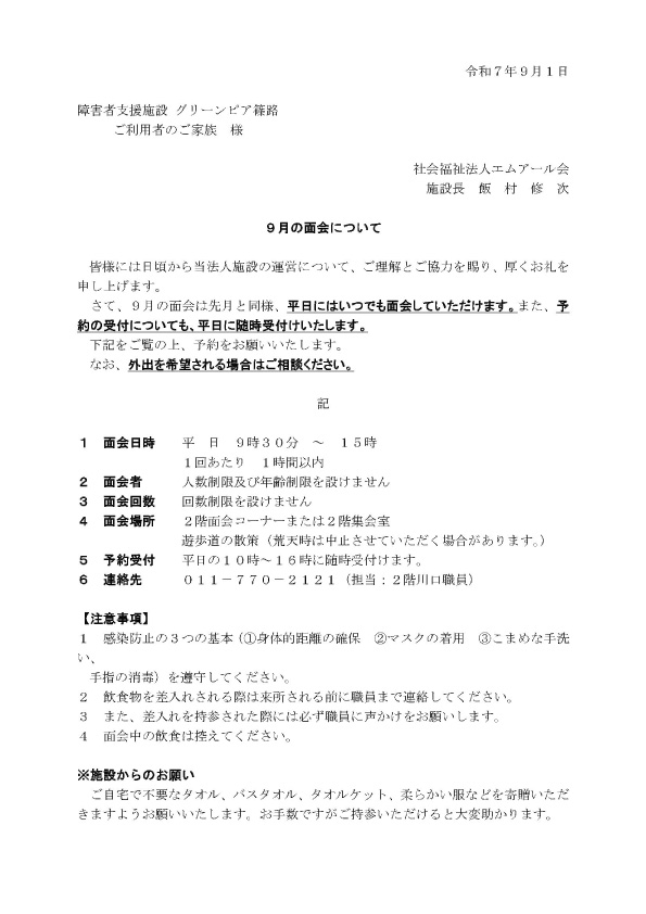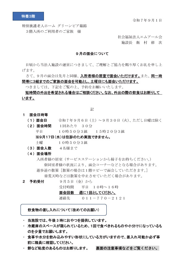 3階ご入所の方のご面会についてお知らせいたします。 【注意事項】 新型コロナウイルスは例年と同様に、お盆期間の人の往来により感染者が増加して います。また、最近、新たな変異株が流行しているとの報道...全文を読む