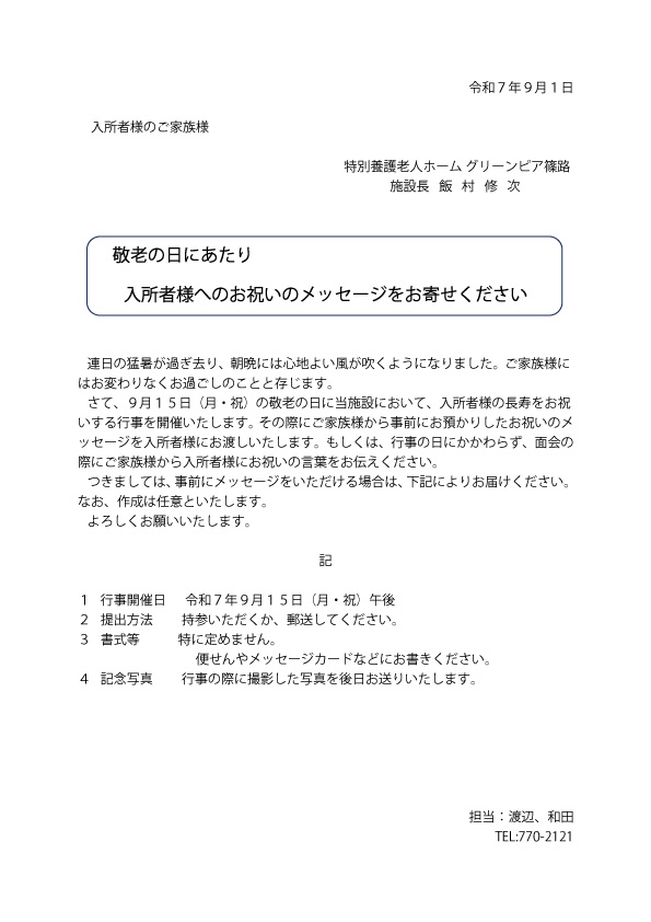 敬老のお祝いに、ご家族様からのメッセージをお寄せ下さい。