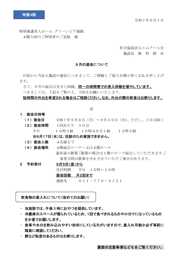 4階ご入所の方のご面会についてお知らせいたします。 【注意事項】 新型コロナウイルスは例年と同様に、お盆期間の人の往来により感染者が増加してい ます。また、最近、新たな変異株が流行しているとの報道が...全文を読む