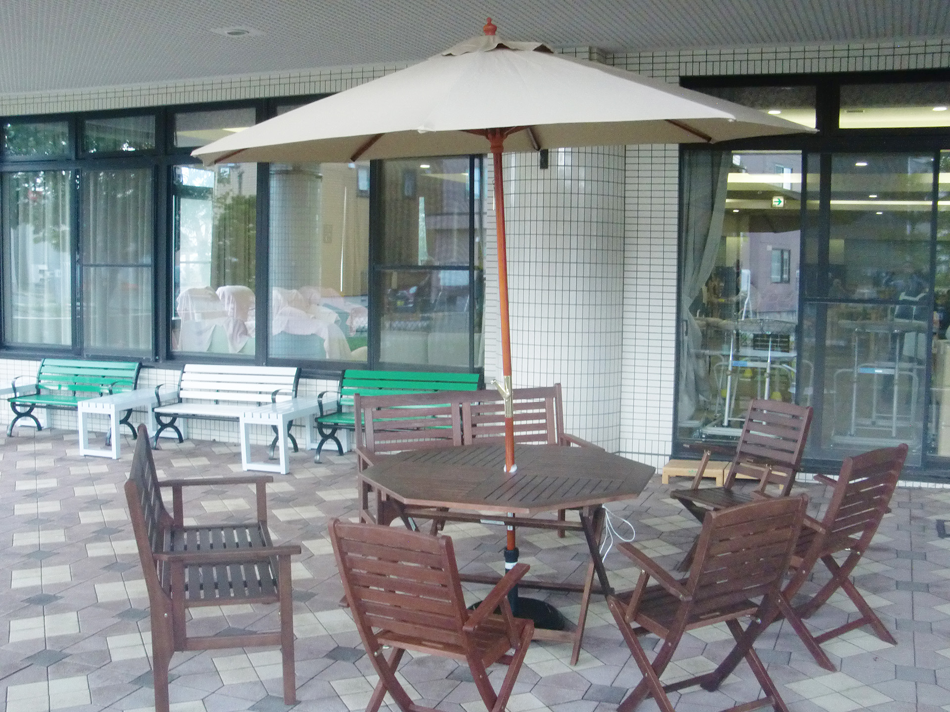 正面玄関前テラスに「パラソル付きガーデンテーブル」を設置しました。 利用者様・ご家族様にはご自由にお寛ぎいただければと思います。
