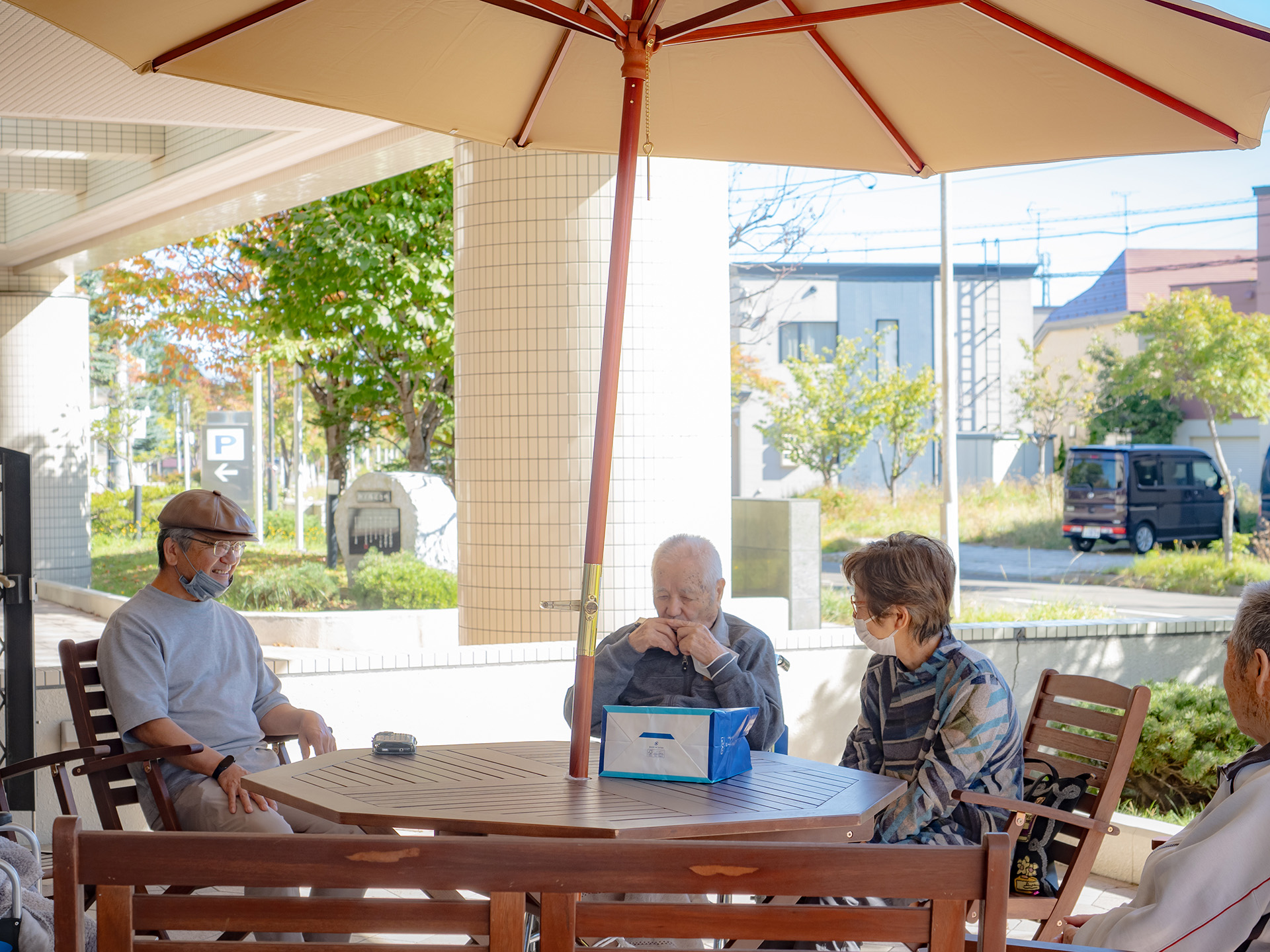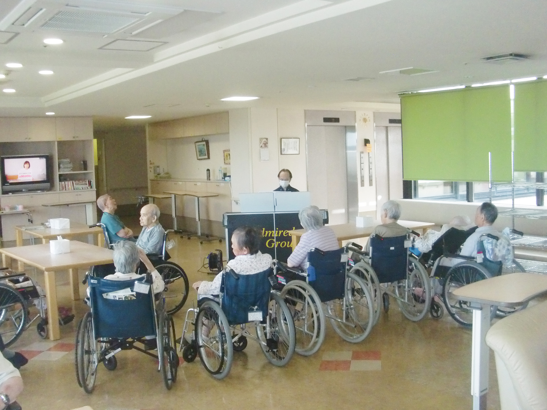 ご面会の際に玄関前テラスをご利用いただけます。 お天気の良い日はぜひどうぞ。 この日はご入所者様がテラスでハーモニカを吹いている姿があり ご面会にいらしたご家族様が笑顔で耳を傾けていました。
