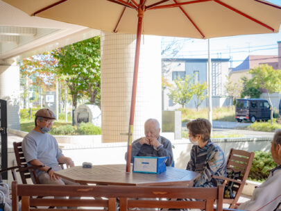 9月30日 玄関前テラスでのご面会 ご面会の際に玄関前テラスをご利用いただけます。 お天気の良い日はぜひどうぞ。 この日はご入所者様がテラスでハーモニカを吹いている姿があり ご面会にいらしたご家族様が笑顔で耳を傾けていました。