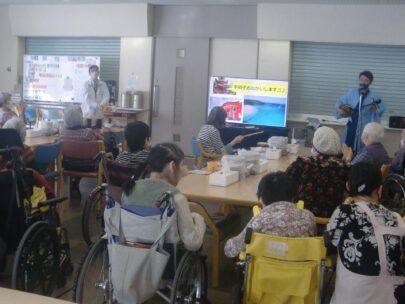 健康セミナー 1階デイサービスセンターでヤクルト様の健康セミナーがあり、 腸トレマスターの方による講義と、沖縄民謡の演奏がありました。 お土産にヤクルトを頂き、皆さんで民謡に合わせて手拍子をするなど 楽しまれたご様子でした。