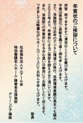 当法人では、2020年より 年賀状でのご挨拶を控えさせて頂いております。 何卒ご理解賜りますよう、よろしくお願い申し上げます。